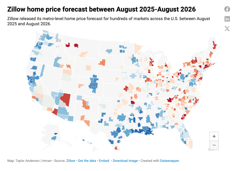 Zillow’s latest forecast points to only modest national price growth of about 1.2% over the next year, but that trend won’t look the same everywhere.